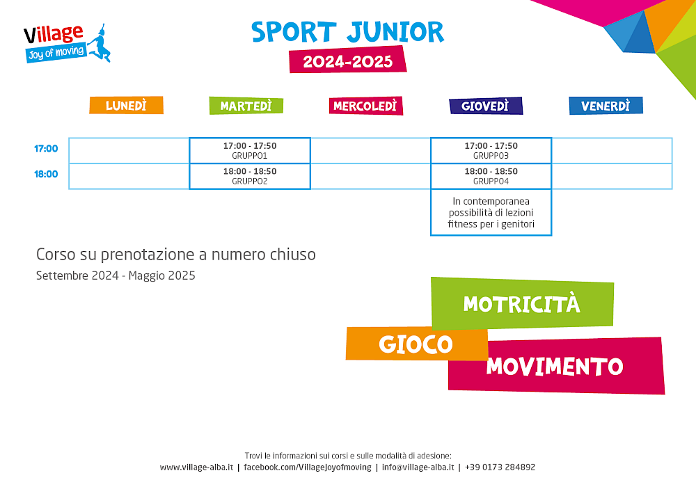 I piccoli, seguiti dagli istruttori del Village, potranno sperimentare in completa sicurezza salti e lanci, giochi di equilibrio e movimento a corpo libero, utilizzando diversi attrezzi e materiali per sviluppare le abilità motorie di base. Grazie ad attività coinvolgenti e divertenti, svilupperanno la loro creatività e consolideranno le abilità di vita, le relazioni con gli altri, l’autoregolazione, il rispetto delle regole, l’autonomia.